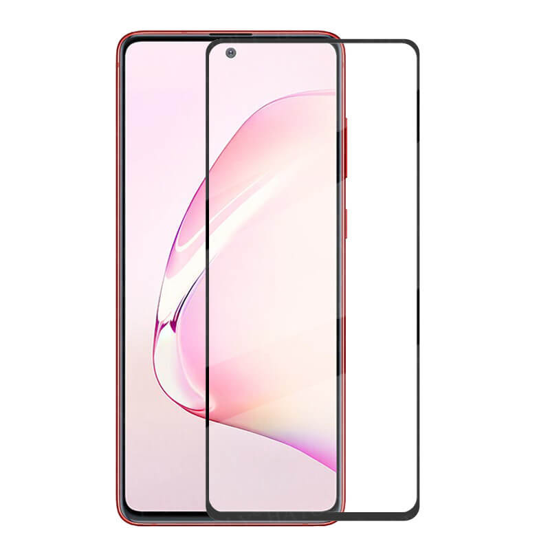 Sticla de protecție 3D cu cadru negru este fabricată special pentru telefonul Samsung Galaxy Note 10 Lite N770F și include decupaje pentru butoane, difuzor.